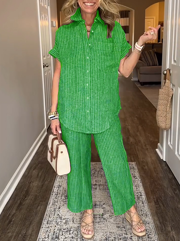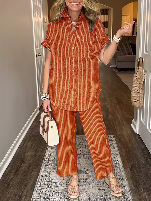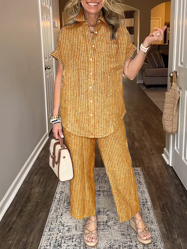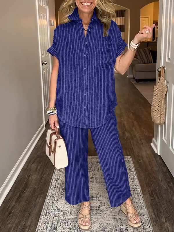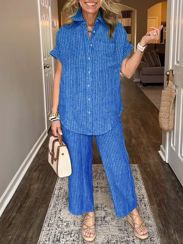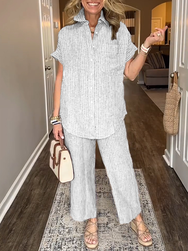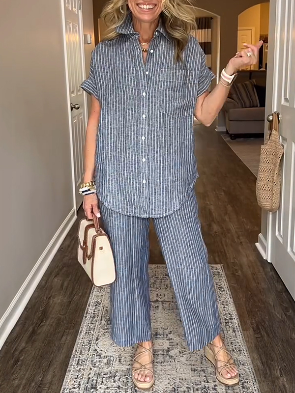 This cotton and linen striped classic pocket shirt set combines elegance with casual simplicity for any occasion.